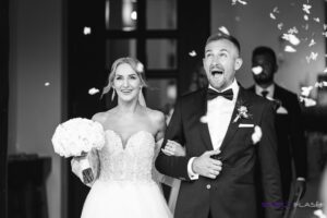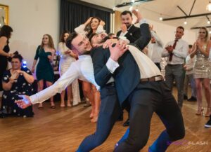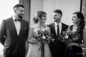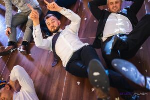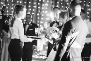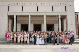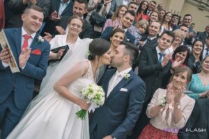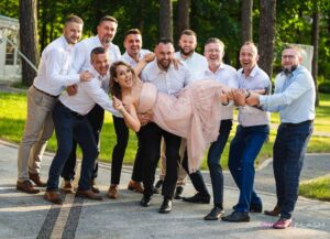 Zdjęcia grupowe robimy najczęściej w dwóch okolicznościach. Pierwsze to zaraz po wyjściu z kościoła. Tutaj mamy duże szansę, że uchwycimy na zdjęciu wszystkich uczestników ceremonii ślubnej. Drugą okazją do zrobienia zdjęcia grupowego jest wesele, najczęściej w pierwszej godzinie po przybyciu gości weselnych. Takie zdjęcie grupowe można wykonać zarówno na sali weselnej, w patio lub ogrodzie.